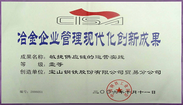 2006年8月,由宝思公司承建的敏捷供应链系统开发与实施项目荣获冶金企业现代化管理创新成果 一等奖