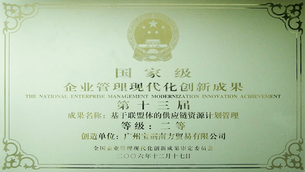 2006年12月,由宝思公司承建的供应链资源计划系统开发与实施项目荣获全国企业现代化管理创新成果 二等奖