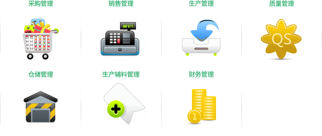 系统主要包括采购管理、销售管理、生产管理、质量管理、仓储管理、生产辅料管理、财务管理等模块。